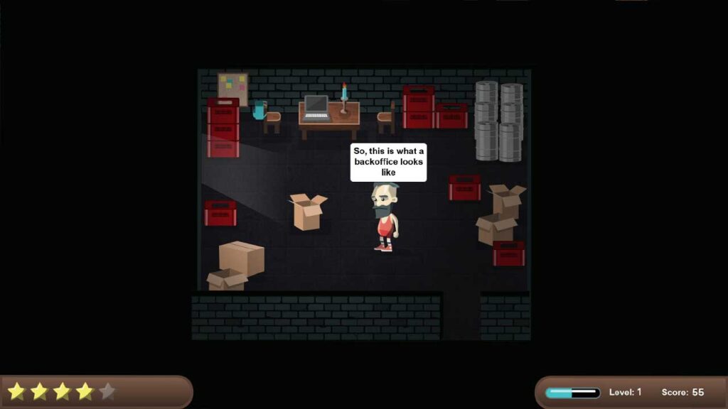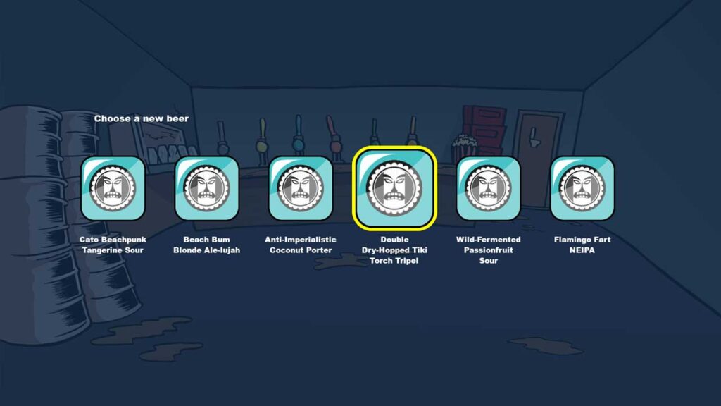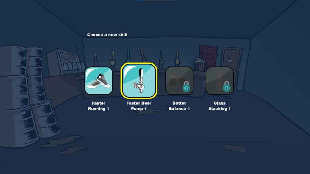 Існуе таксама сістэма абнаўлення, якая дае новыя здольнасці паміж кожным раундам, дзе вы можаце выбіраць з такіх варыянтаў, як павелічэнне хуткасці бегу, больш хуткае выраб вінаў або зніжэнне верагоднасці ўзнікнення выпадковых падзей. Гэты трэці выпадак максімальна прадухіляе разбіванне шкла, а шкло разбіваецца толькі раз у некалькі дзён. Яшчэ адна барная гульня зусім не абмяжоўвае вас у вывучэнні новага, вам трэба вучыцца на працы, і гэта сведчыць аб нявопытнасці Фрэнка.