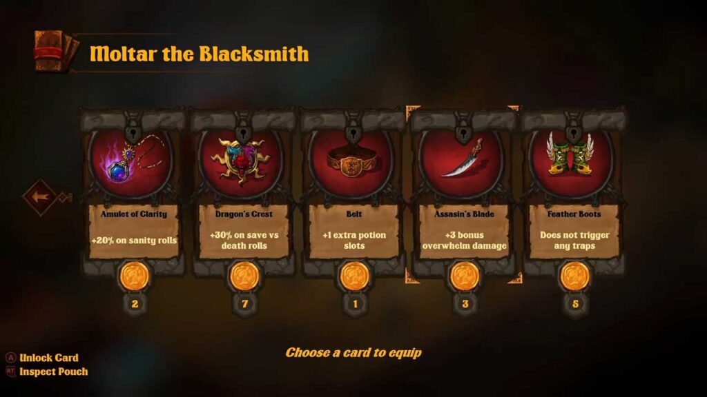 Толькі не чакайце велізарных калод для кожнага героя. Праўда ў тым, што, на маю думку, для кожнага персанажа можна разблакіраваць каля 5-6 дадатковых карт, з якіх, на маю думку, мы можам насіць 3 (дадаючы да 2-3 стартавых карт для кожнага персанажа). Каб часткова кампенсаваць гэты недахоп, мы таксама можам разблакіраваць зброю, зелля і руны (гэтыя элементы агульныя для ўсіх нашых герояў), якія даюць нам больш характарыстык, павышэнняў і здольнасцей і дапамагаюць нам крыху больш наладзіць нашу каманду (хаця ў кожным тыпе не так шмат разнастайнасці).
