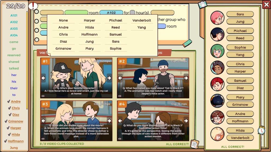 Ёсць сістэма падказак, якая вылучае падказкі ў асяроддзі з хуткім часам папаўнення і заклікае вас звязваць іх разам, але на самой справе яна ледзь дае дастаткова кіраўніцтва, каб цалкам сабраць разам ключавую інфармацыю, такую як поўнае імя або фота персанажа. Значна больш карыснай з’яўляецца функцыя, якая дазваляе пацвердзіць, ці правільныя вашы адказы для пэўнага раздзела. На жаль, гэта часам заахвочвае гульцоў навязваць рашэнні, што значна зніжае задавальненне і робіць гульню менш інтуітыўнай.