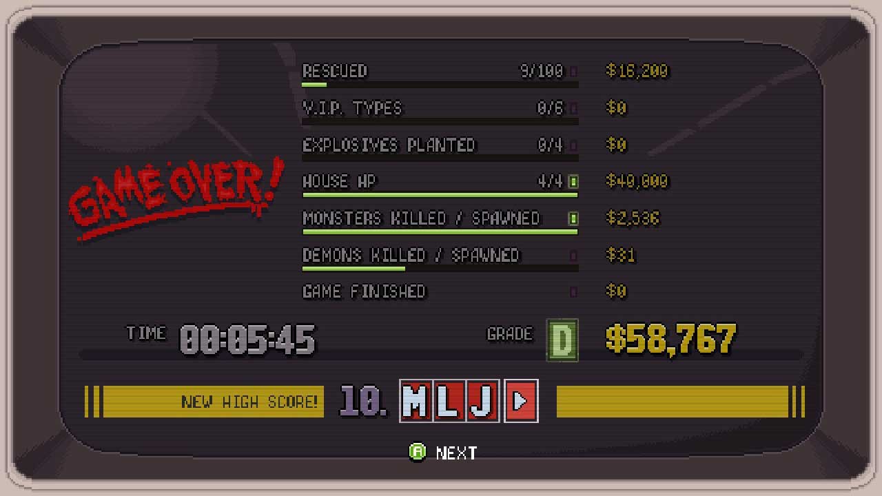 Праз некаторы час гэта можа стаць вельмі заблытаным, калі вы бегаеце з пакоя ў пакой, спрабуючы ўтрымаць іх ад разбурэння. Ёсць два тыпу тых, хто выжыў: звычайных тых, хто выжыў, якіх можна знайсці ў пакоях і некаторыя з іх маюць зброю, і тых, хто выжыў VIP, якіх можна знайсці ў пэўных месцах, якія даюць вам бонусы пры выратаванні, напрыклад жывыя або коткі, якія імгненна забіваюць усіх монстраў у вашым бягучым пакоі.