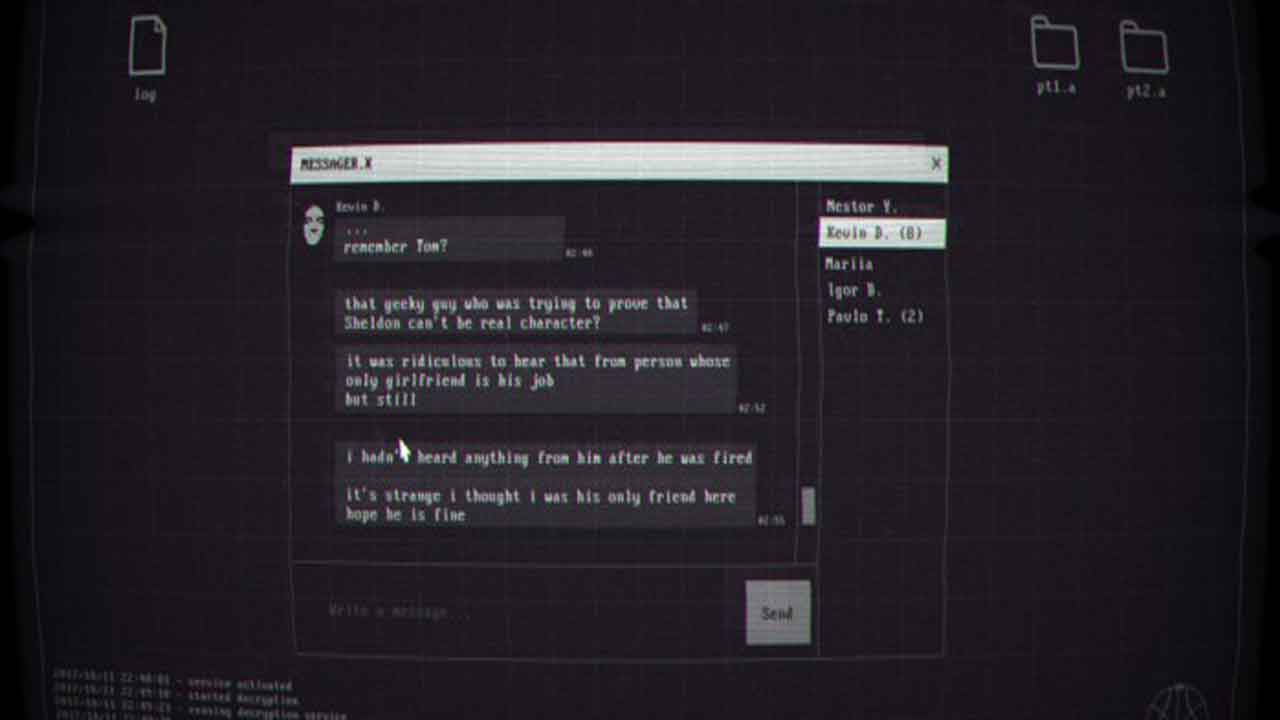 Я знайшоў гісторыю больш пераканаўчай, чым загадкі ў гульні, нават калі гэта была памылка. Вашы зашыфраваныя гісторыі чатаў непрыдатныя, гэта азначае, што калі вы хочаце прачытаць іх хранічна, вам прыйдзецца звязаць іх самастойна. На самай справе, большая частка гісторыі гульні залежыць ад таго, каб усё скласці разам.