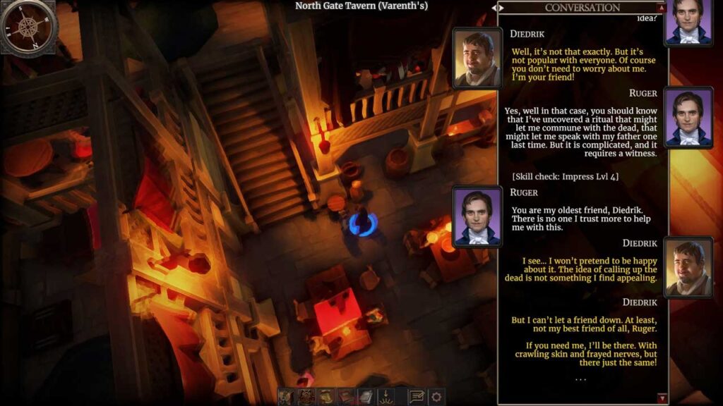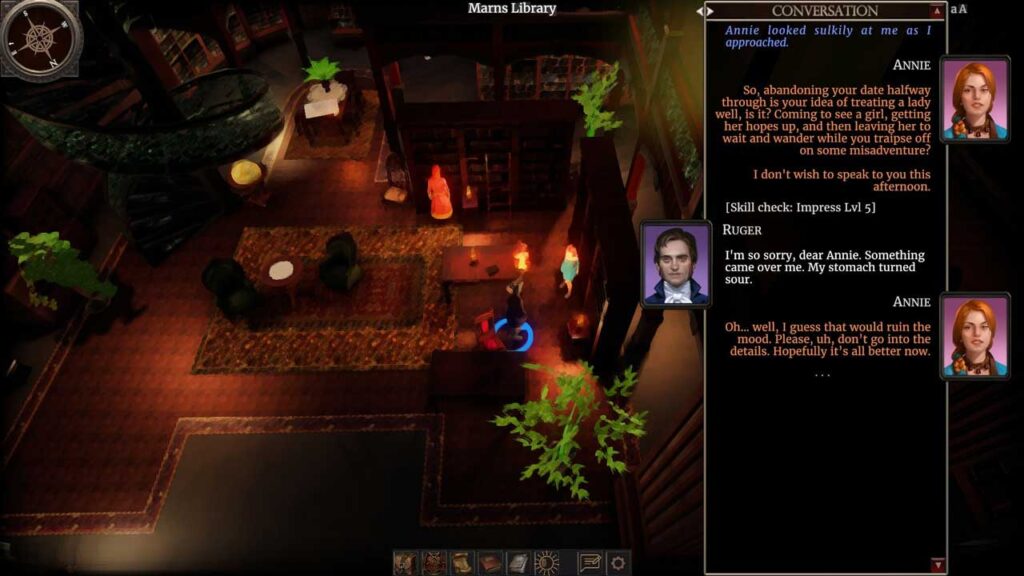 Ваш выбар таксама ўплывае на ўзаемадзеянне па-за боем, хоць і не такім чынам, каб кардынальна змяніць асноўны сюжэт. Большасць з іх уплывае на тое, як персанажы ставяцца да вас і якія шляхі вы можаце выбраць для вырашэння праблем. Вы не можаце абыйсці кожную праверку, асабліва на больш высокай складанасці, таму моцныя і слабыя бакі вашай зборкі застаюцца актуальнымі на працягу ўсёй гульні. Усё становіцца яшчэ больш цікавым у сярэдзіне і канцы гульні, калі праверкі становяцца больш жорсткімі і назапашваюцца пастаянныя перашкоды, часам закрываючы варыянты, але адкрываючы цікавыя. Я рэкамендую мець некалькі дадатковых статыстычных дадзеных, бо гульня ўзнагароджвае няўдачы цікавымі ўзаемадзеяннямі, і пошук новых спосабаў дасягнення вашых мэтаў, калі шлях зачынены, з’яўляецца часткай яе прывабнасці.
